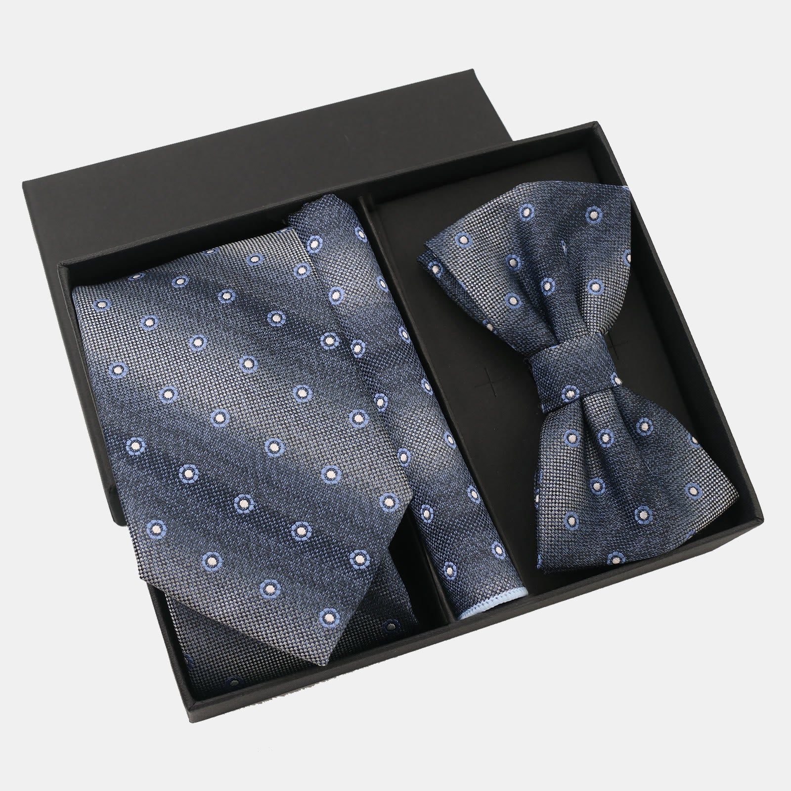 - The set includes a necktie a bow tie and a pocket square all designed with consistent details for a polished look;
