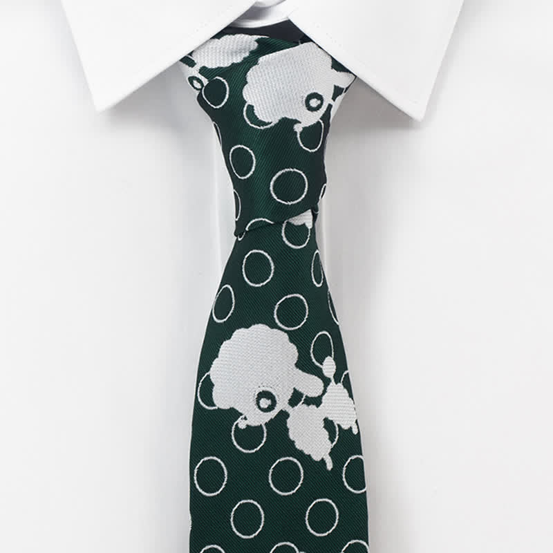 This necktie depicts a repeat of white circle and cute sheep in a pattern on top of a solid green background, cute and energetic!