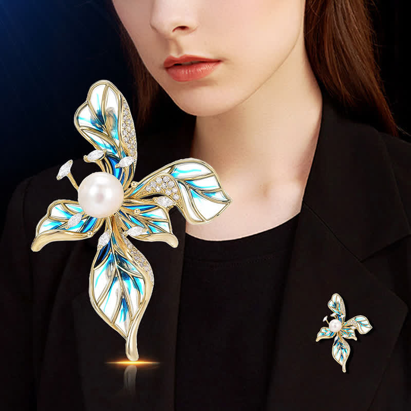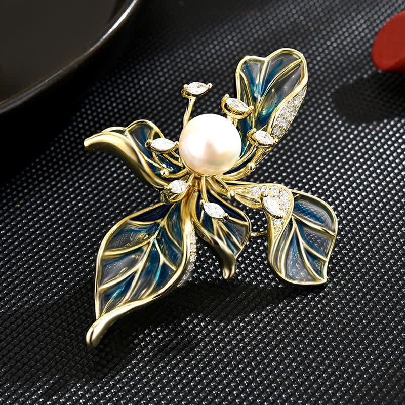 - The Iris brooch consists of several spreading leaves with pearls set in the center.