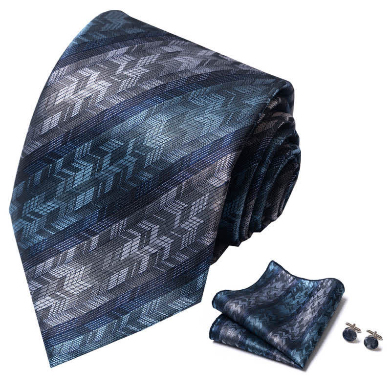 This artfully controlled necktie in teal, gray and dary blue is absolutely stunning. Featuring a dimensional striped design, this Teal & Gray necktie will effortlessly elevate your favorite ensembles.