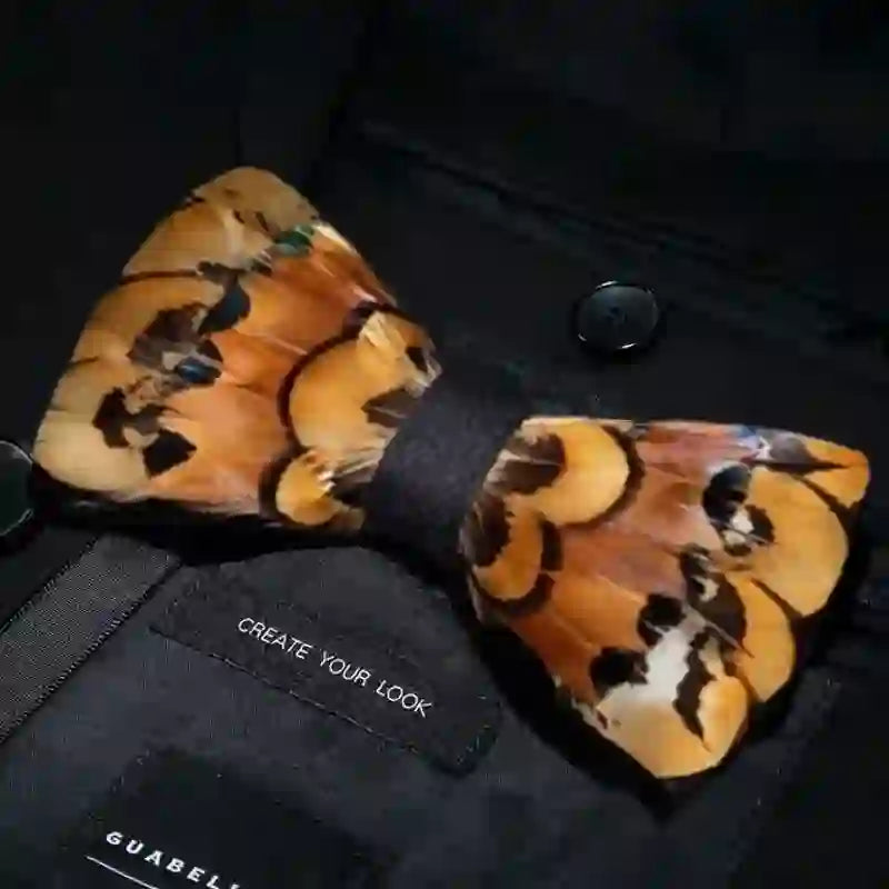- Features: This stunning neutral bow tie, beige paired with gold pheasant feathers, creates a strong, angular design.