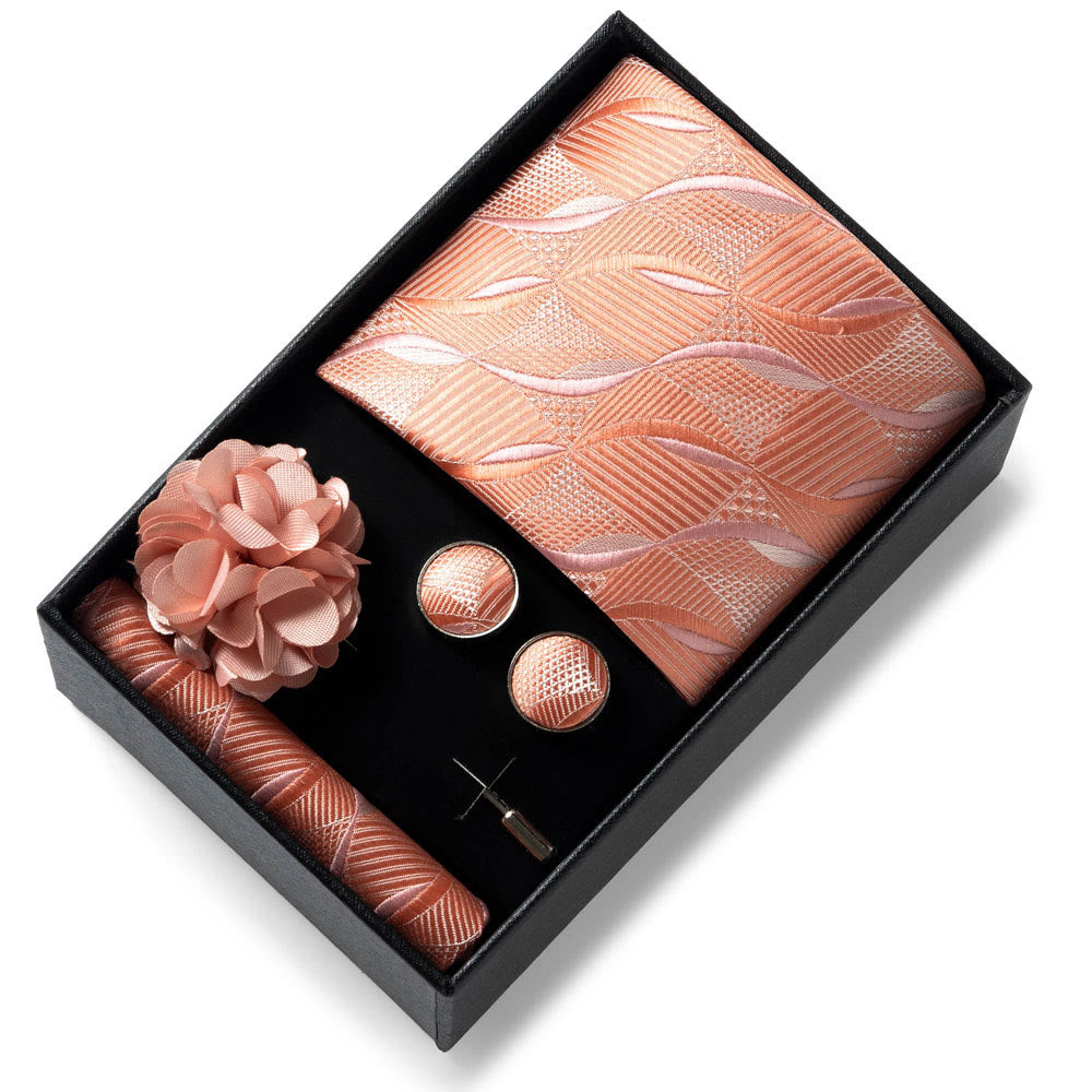 • The set includes a necktie a pocket square a pair of cufflinks and a lapel flower all designed with consistent pattern and color details for a sleek and unified overall look.