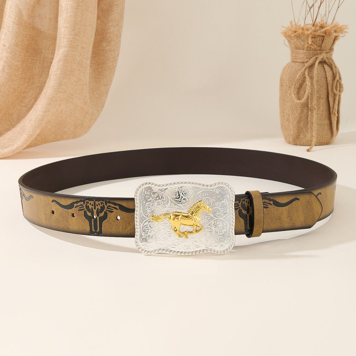 - The core belt buckle is made of gold and silver alloy material, with a three-dimensional relief of a golden galloping horse in the center, surrounded by delicate silver curled grass pattern carvings, and edge rope pattern decorations adding a sense of delicacy. The overall design is gorgeous and rich in layers.