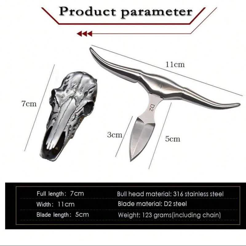 This longhorn can be worn either as a necklace or clipped to your pants, making it highly concealable. A fixed push dagger knife was inserted in the sheath.