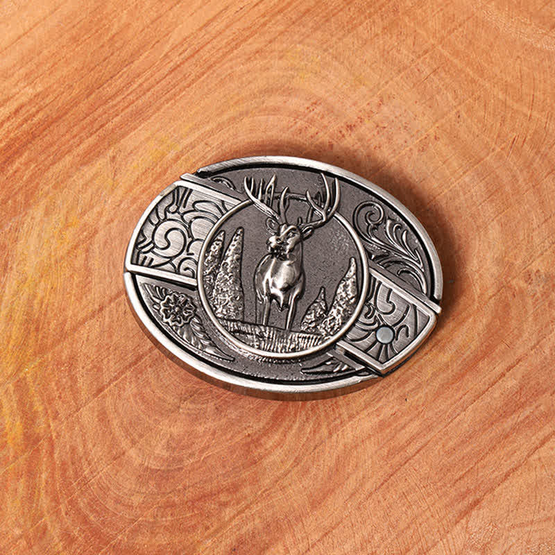 - This classic buckle features a scene of deer in the forest engraved onto it.
