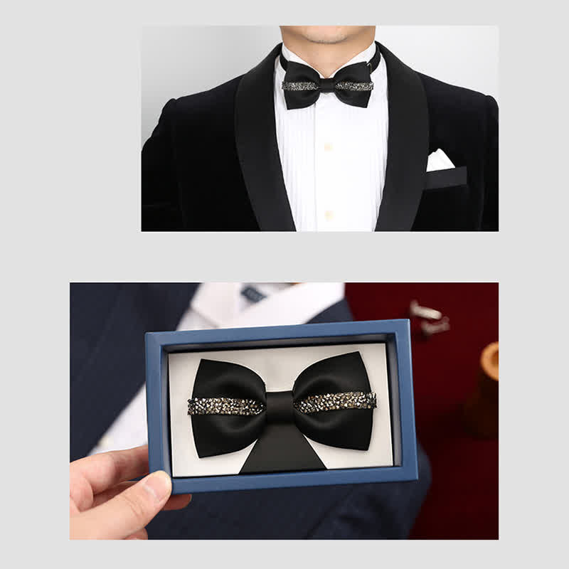 - These beautiful bow ties are made with polyester and are accented with a rhinestone chain.