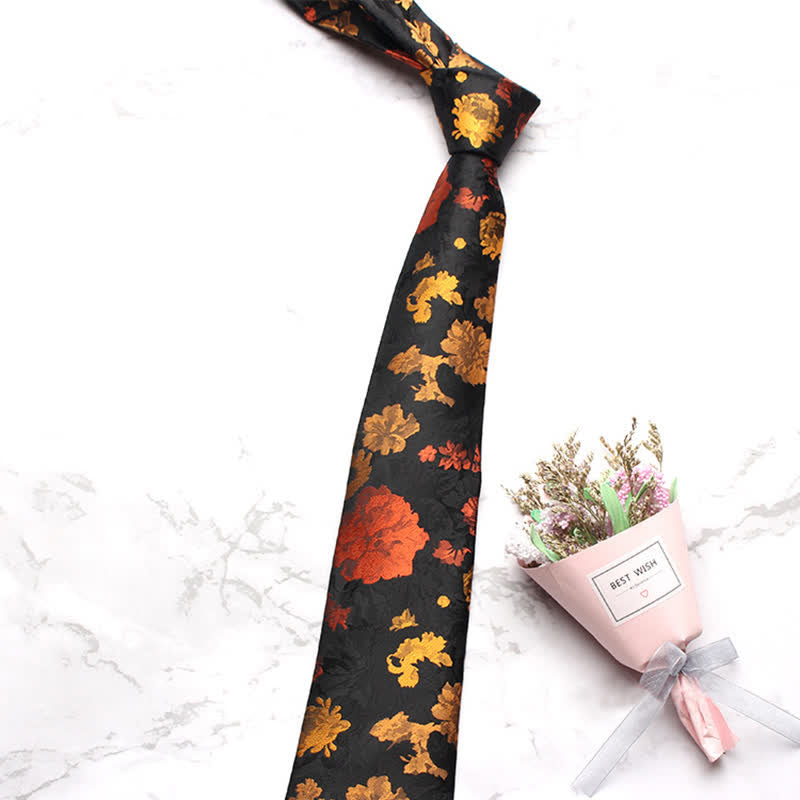 It's an incredibly chic necktie with a palette of vivid reds, oranges and black. This floral woven design takes a modern approach to menswear fashion.