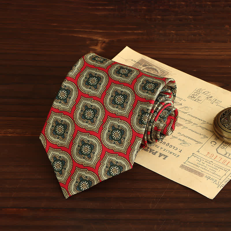 Experience a touch of timeless sophistication with the large medallion print tie in a deep chili pepper red with shade of green.