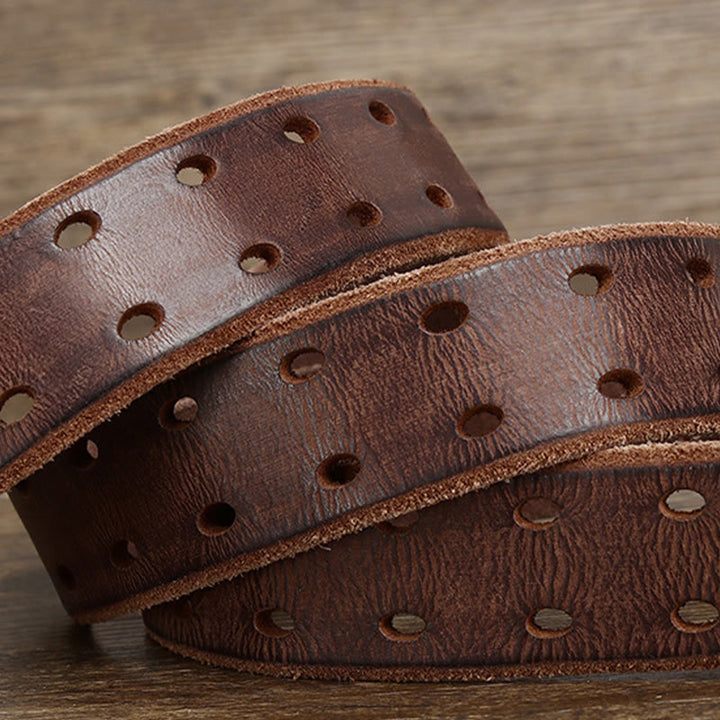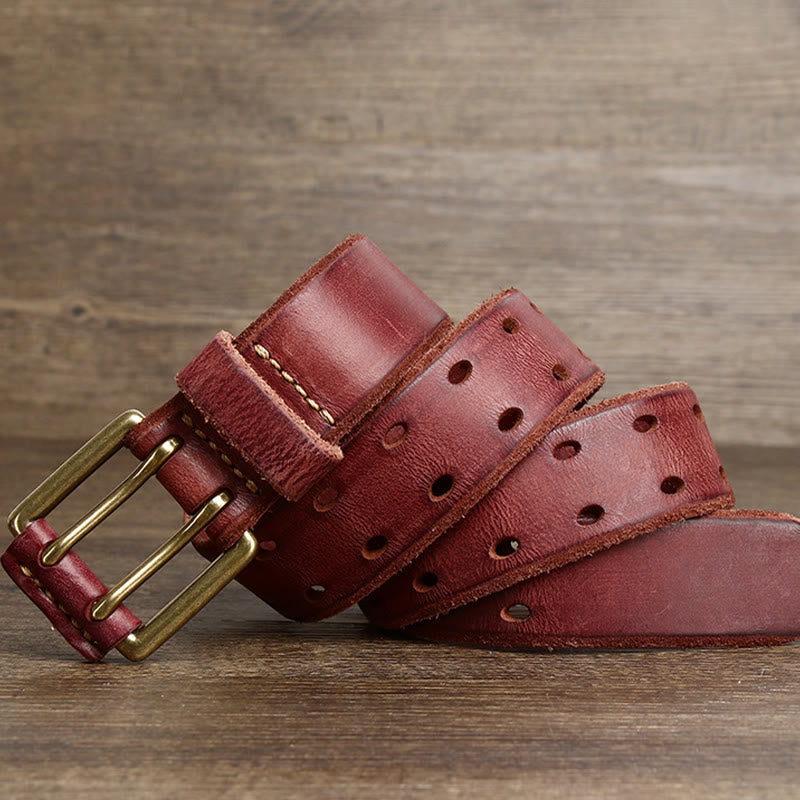 The buckle features a roller end with double prong. If you are looking for a belt that reflects your outstanding personality, this double prong and double holes jeans belt might be the one. The unique design of this casual belt won’t let you go unnoticed.