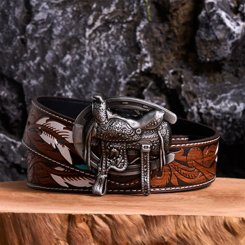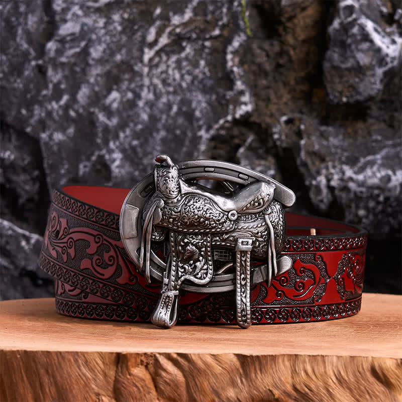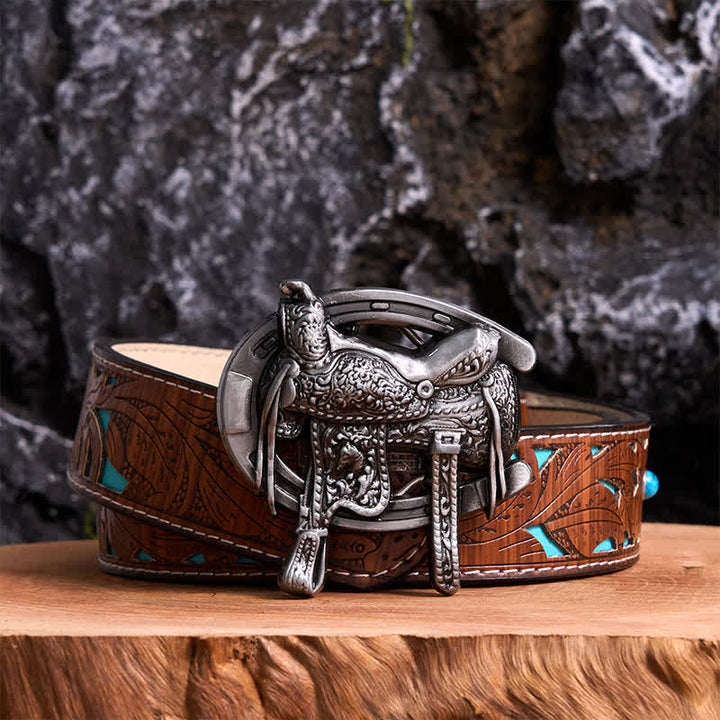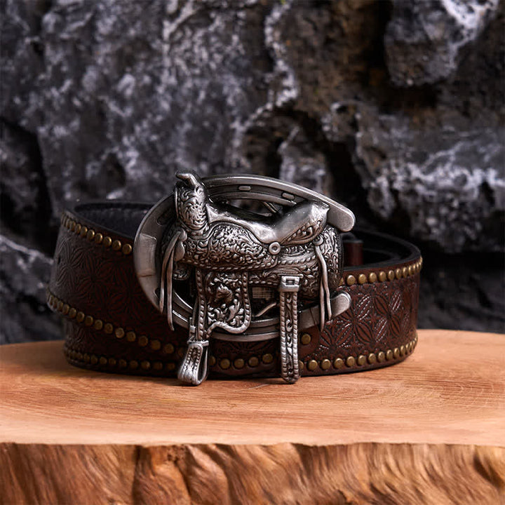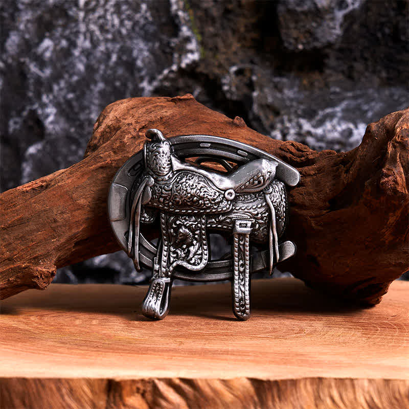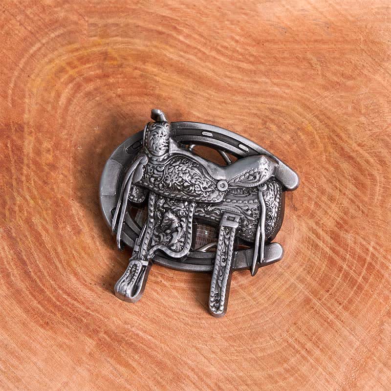 The buckle features a unique Saddle & Horse Shoe design that enhances any outfit with a touch of flair. Fits most standard belt straps, making it a practical addition to your accessories.