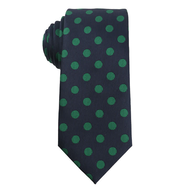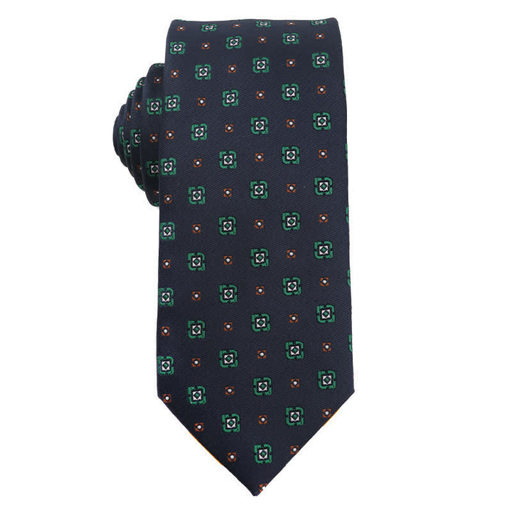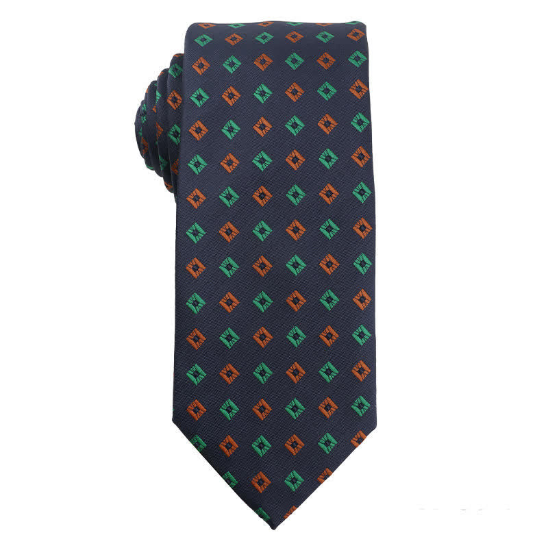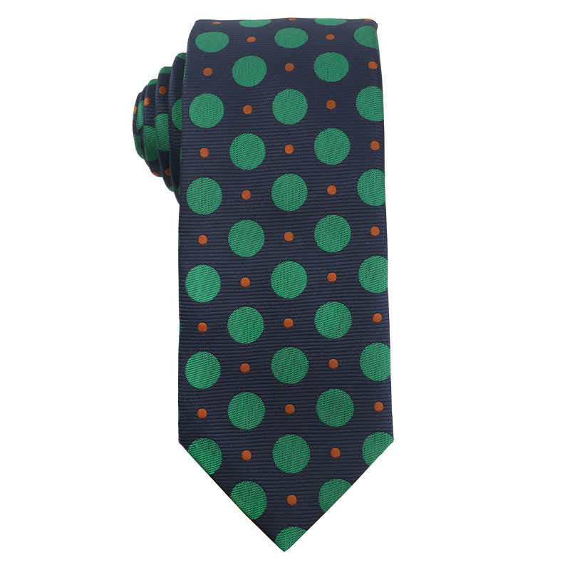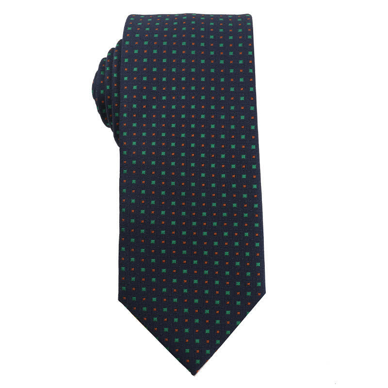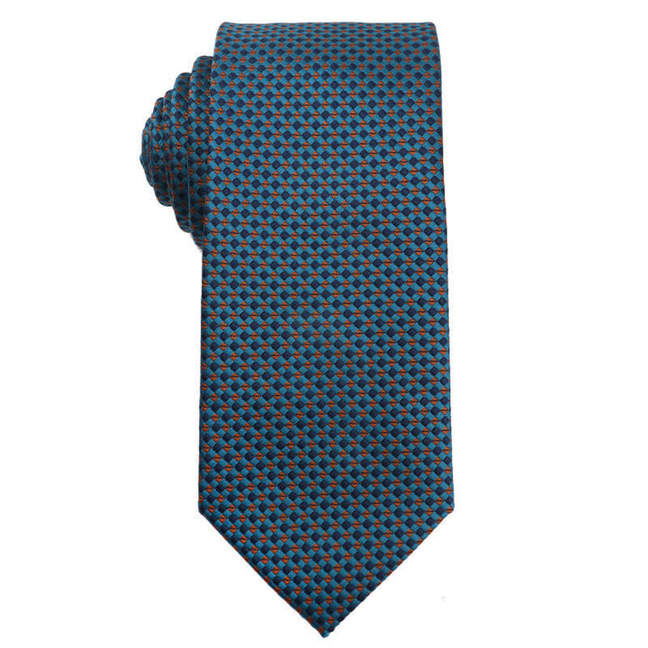 A cleverly patterned necktie in jasper and turquoise, with just the right scale of pattern and an amazing craft. These motifs have a retro aesthetic that is both artsy and fashion savvy.