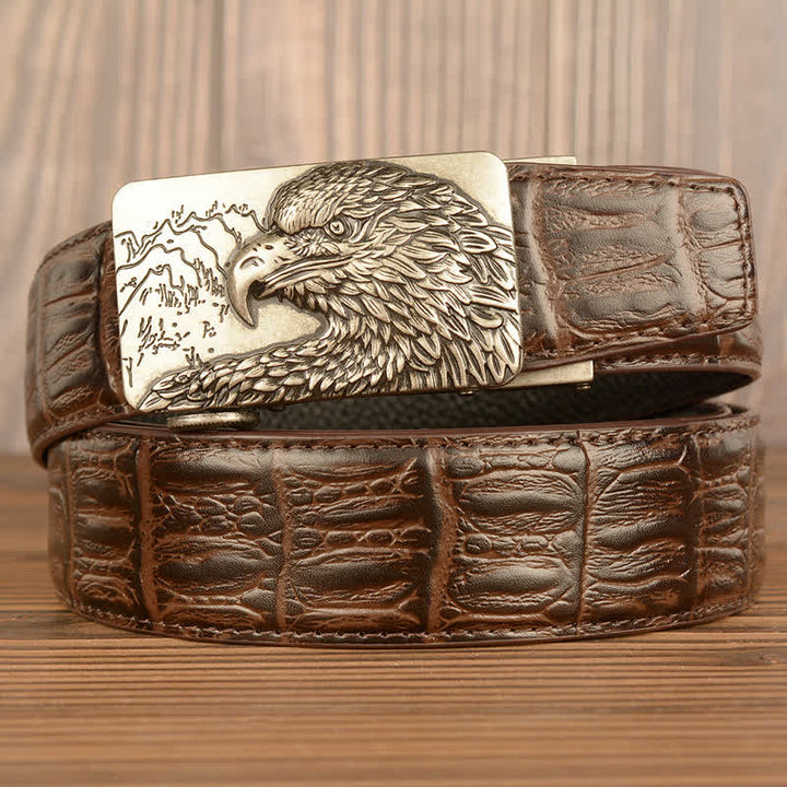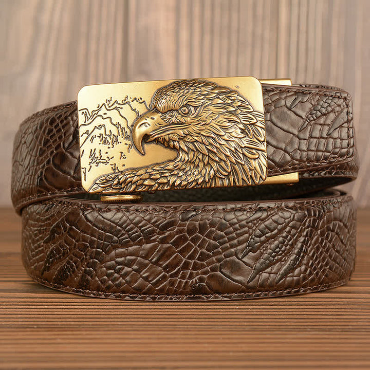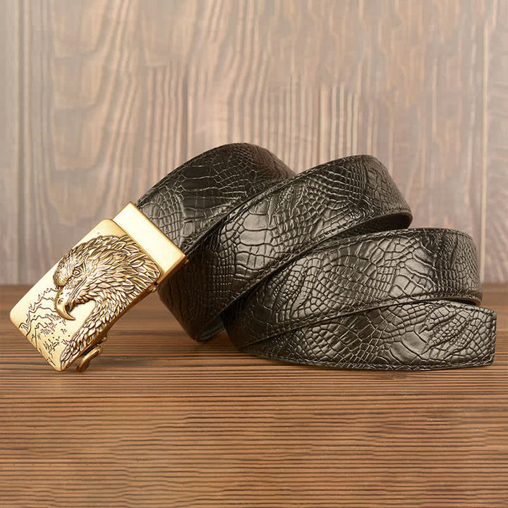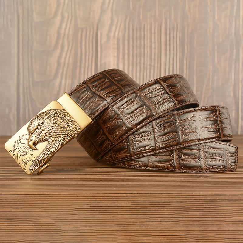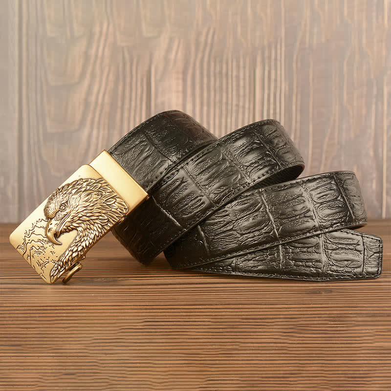 - The buckle is made from alloy with an eagle pattern and the belt has a crocodile skin pattern.