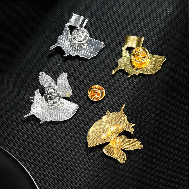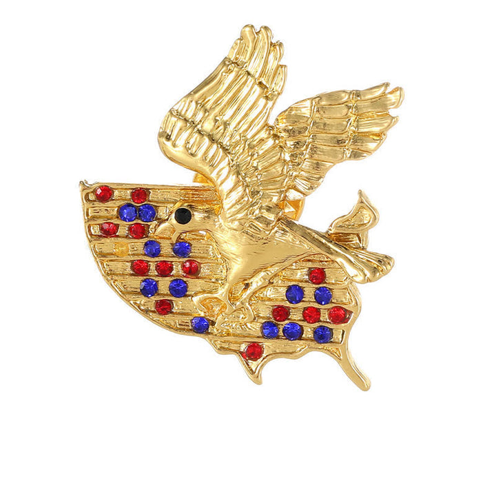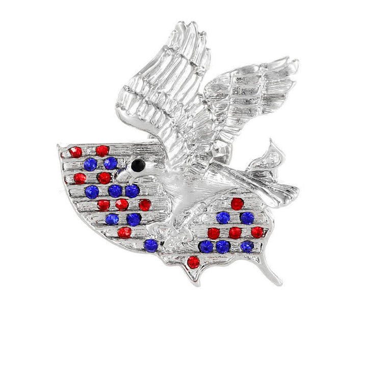 - This symbolic brooch is adorned with glimmering red and blue rhinestones.