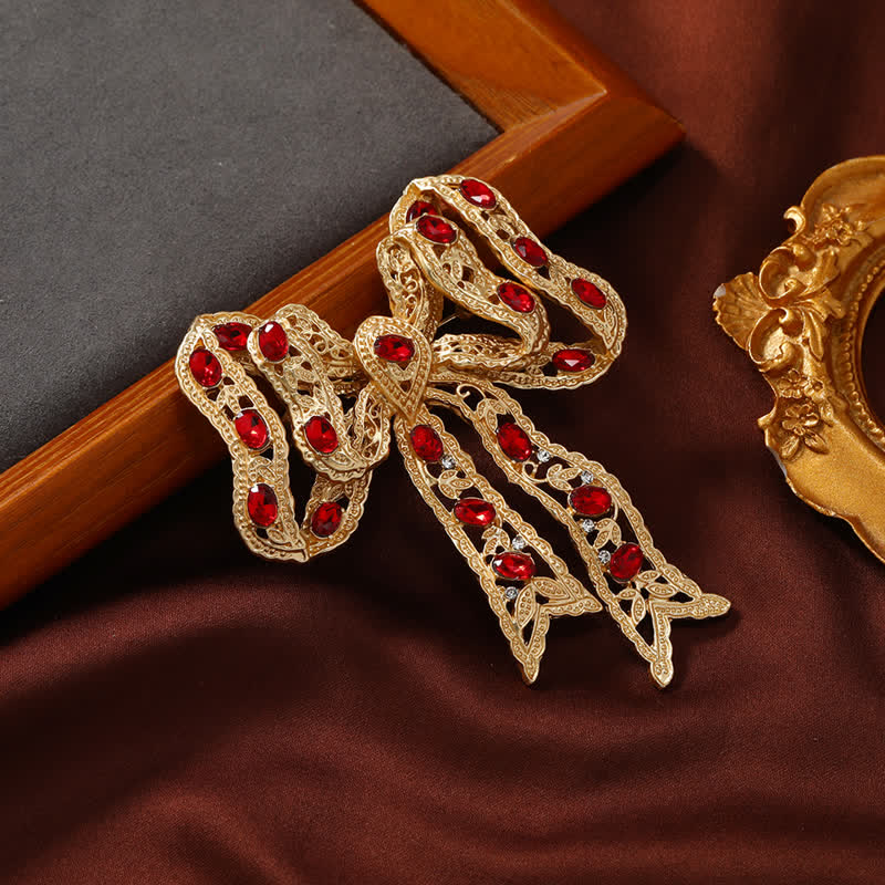 - It features a gracefully waved metallic ribbon bow design accented with a striking red stone detail.